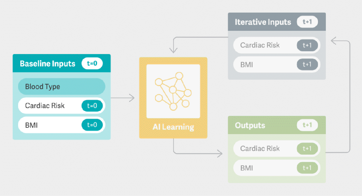 - Time-varying data that evolves from one moment to the next (think a person’s weight or a person’s daily energy usage). This includes variables that could be potential outcomes of interest, like cardiac risk.